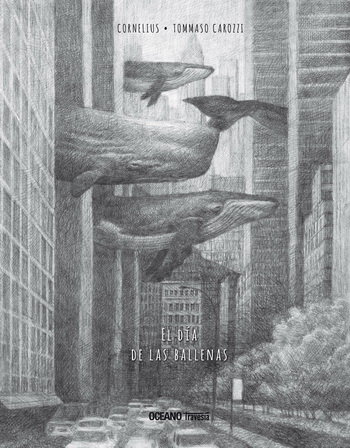 Es una ciudad grande como cualquiera, llena de edificios y automóviles. De pronto, enormes sombras comienzan a cruzar el cielo: ¡son gigantescas ballenas, de todas clases, que cruzan volando como si nadaran! La belleza de esta escena es contrastada por la violencia de la respuesta de los hombres de la ciudad, que deciden atacar con todo. Un libro sin palabras y en blanco y negro que sorprende por la precisión de sus imágenes, la belleza casi cinematográfica de sus páginas y un dramatismo contrapunteado con un enorme sentido del humor.